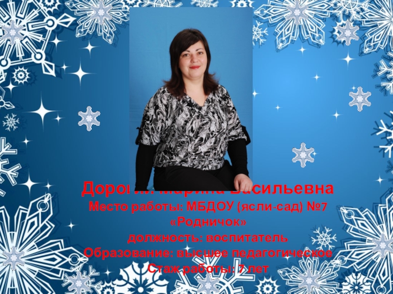 Слайд 23Дорогий Марина Васильевна Место работы: МБДОУ (ясли-сад) №7 «Родничок» должность: воспитатель Образование: высшее педагогическое