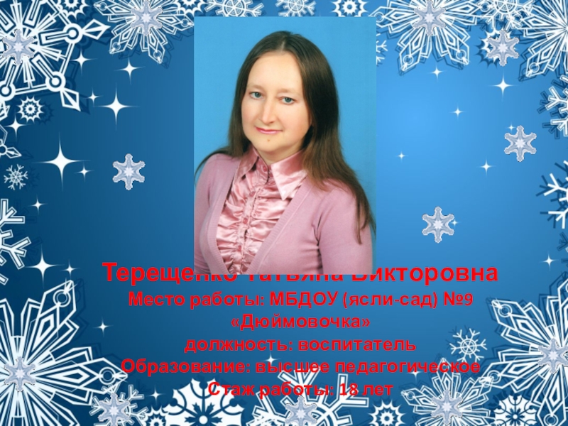 Слайд 25Терещенко Татьяна Викторовна Место работы: МБДОУ (ясли-сад) №9 «Дюймовочка» должность: воспитатель Образование: высшее педагогическое