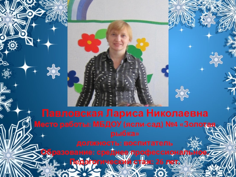 Слайд 21Павловская Лариса Николаевна Место работы: МБДОУ (ясли-сад) №4 «Золотая рыбка» должность: воспитатель Образование: среднее