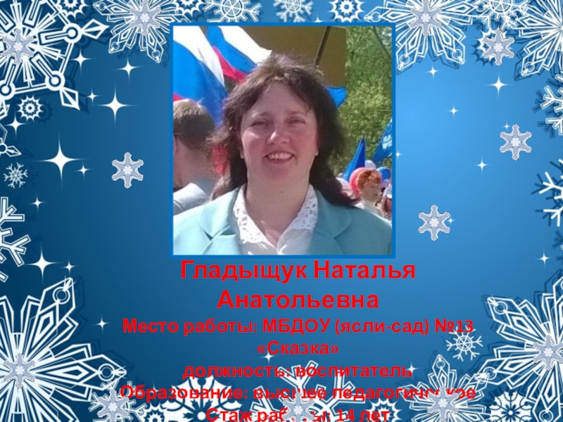 Слайд 31Гладыщук Наталья Анатольевна Место работы: МБДОУ (ясли-сад) №13 «Сказка» должность: воспитатель Образование: высшее педагогическое