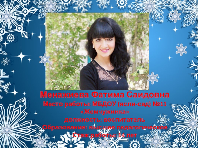 Слайд 29Менажиева Фатима Саидовна Место работы: МБДОУ (ясли-сад) №11 «Жемчужинка» должность: воспитатель Образование: высшее педагогическое