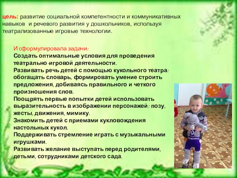 Развивать речь детей с помощью кукольного театра: обогащать словарь, формировать умение строить предложения, добиваясь правильного и четкого произношения слов.