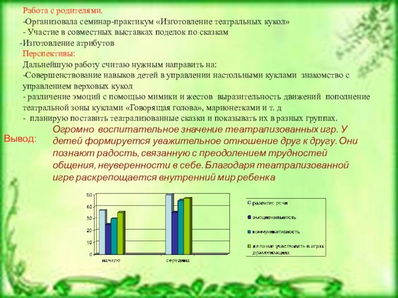 Огромно воспитательное значение театрализованных игр. У детей формируется уважительное отношение друг к другу. Они познают радость, связанную с преодолением трудностей общения, неуверенности в себе. Благодаря театрализованной игре раскрепощается внутренний мир ребенка