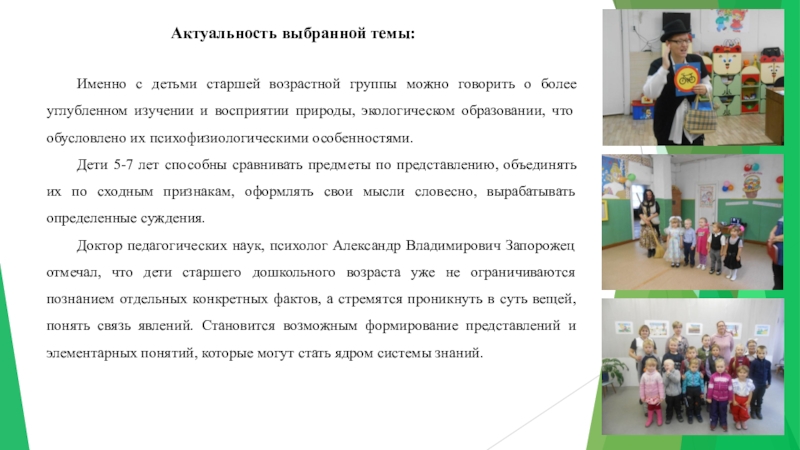 Доктор педагогических наук, психолог Александр Владимирович Запорожец отмечал, что дети старшего дошкольного возраста уже не ограничиваются познанием отдельных конкретных фактов, а стремятся проникнуть в суть вещей, понять связь явлений. Становится возможным формирование представлений и элементарных понятий, которые могут стать ядром системы знаний.