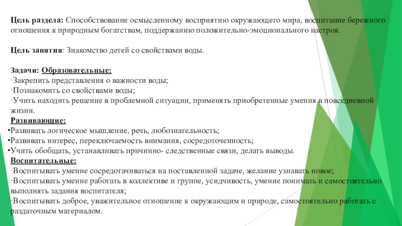 Слайд 5Цель раздела: Способствование осмысленному восприятию окружающего мира, воспитание бережного отношения к