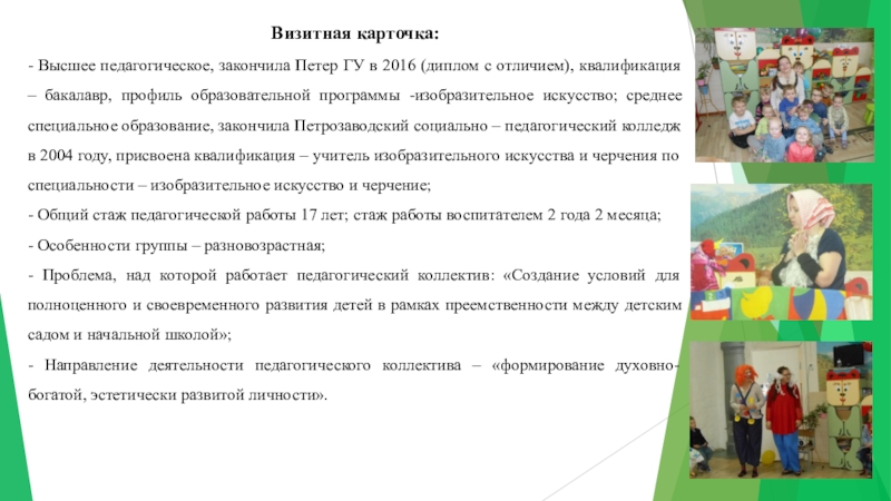 - Общий стаж педагогической работы 17 лет; стаж работы воспитателем 2 года 2 месяца;