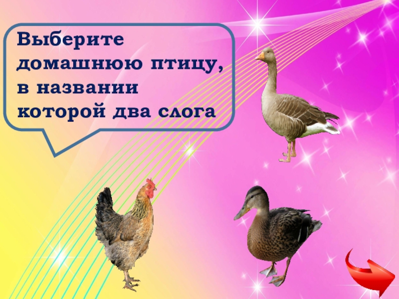 Слайд 34Выберите домашнюю птицу, в названии которой два слога