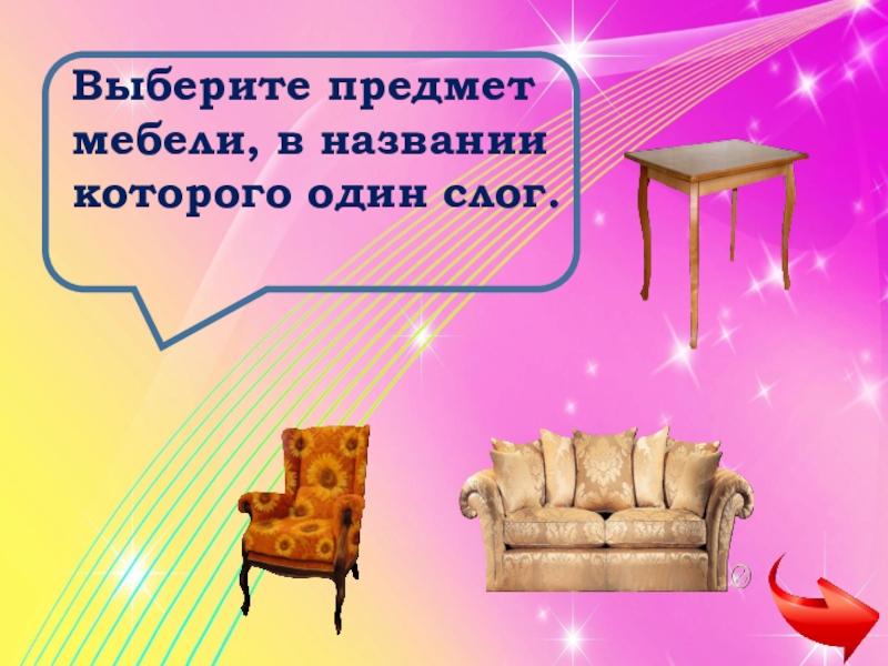 Слайд 35Выберите предмет мебели, в названии которого один слог.