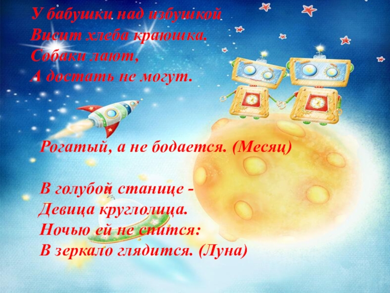 У бабушки над избушкойВисит хлеба краюшка.Собаки лают,А достать не могут.  Рогатый, а не бодается. (Месяц)В голубой станице -Девица круглолица.Ночью ей не спится:В зеркало глядится. (Луна)
