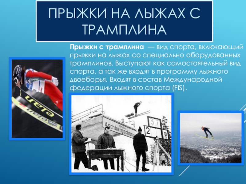 прыжки на лыжах со специально оборудованных трамплинов. Выступают как самостоятельный вид спорта, а так же входят в программу лыжного двоеборья. Входят в состав Международной федерации лыжного спорта (FIS).