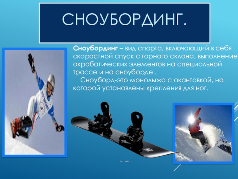 Сноубординг – вид спорта, включающий в себя скоростной спуск с горного склона,