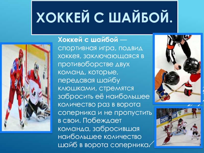 Хоккей с шайбой — спортивная игра, подвид хоккея, заключающаяся в