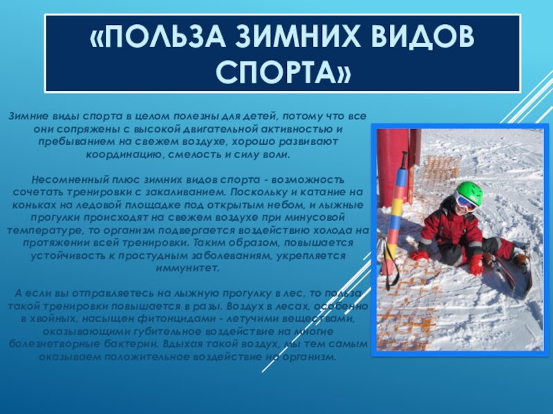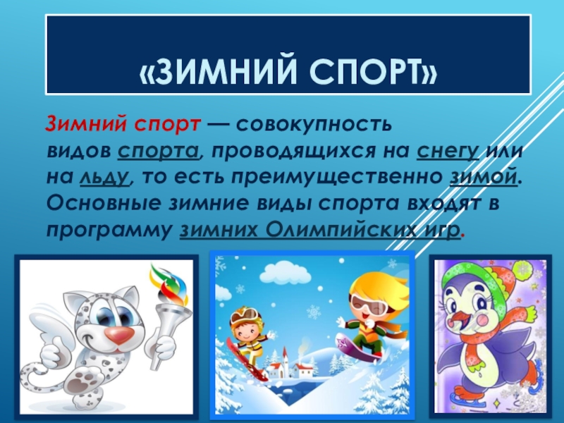 преимущественно зимой. Основные зимние виды спорта входят в программу зимних Олимпийских игр.