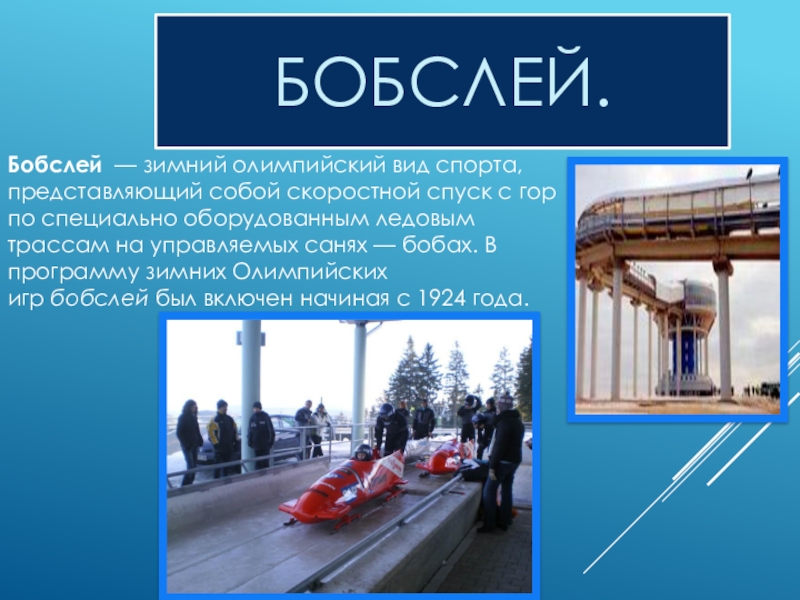 гор по специально оборудованным ледовым трассам на управляемых санях — бобах. В программу зимних Олимпийских игр бобслей был включен начиная с 1924 года.