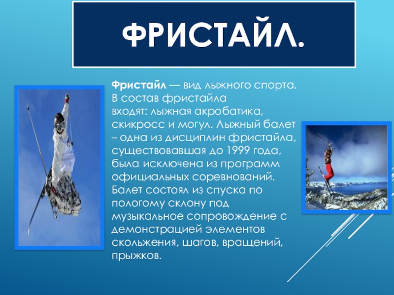 Фристайл — вид лыжного спорта. В состав фристайла входят: лыжная акробатика, скикросс и