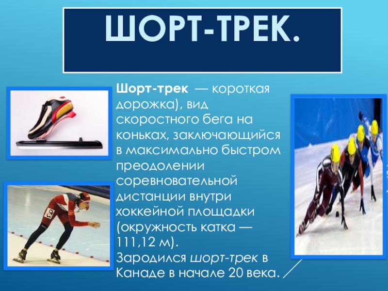 быстром преодолении соревновательной дистанции внутри хоккейной площадки (окружность катка — 111,12 м). Зародился шорт-трек в Канаде в начале 20 века.