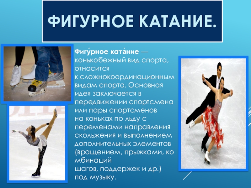Фигу́рное ката́ние — конькобежный вид спорта, относится к сложнокоординационным видам спорта. Основная идея