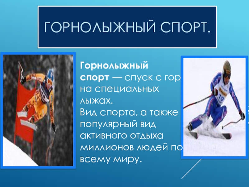 Горнолыжный спорт — спуск с гор на специальных лыжах.