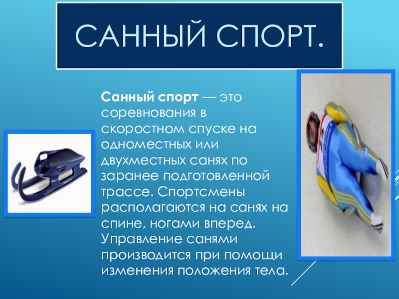 двухместных санях по заранее подготовленной трассе. Спортсмены располагаются на санях на спине, ногами вперед. Управление санями производится при помощи изменения положения тела.