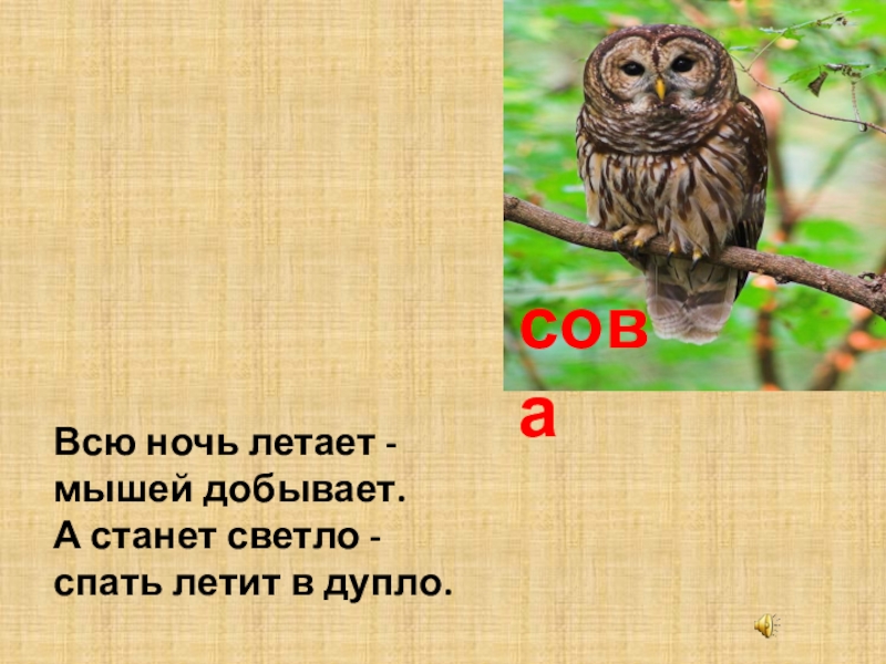 соваВсю ночь летает - мышей добывает. А станет светло - спать летит в дупло.