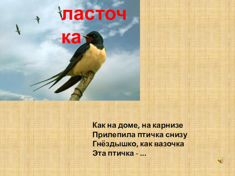 ласточкаКак на доме, на карнизе Прилепила птичка снизу Гнёздышко, как вазочка Эта птичка - ...
