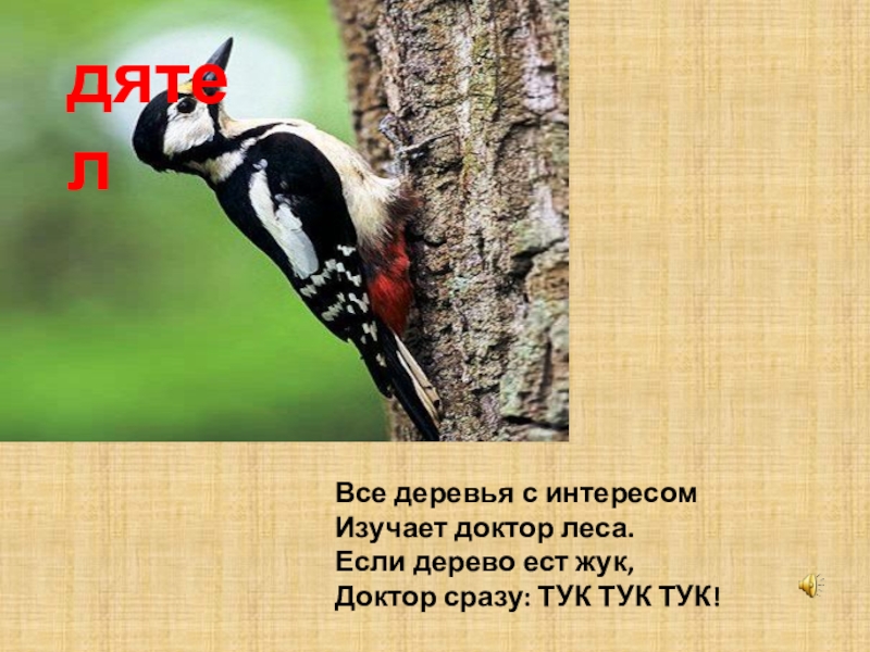 дятелВсе деревья с интересом Изучает доктор леса. Если дерево ест жук, Доктор сразу: ТУК ТУК ТУК!