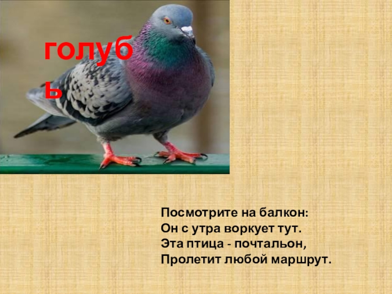 голубьПосмотрите на балкон: Он с утра воркует тут. Эта птица - почтальон, Пролетит любой маршрут.