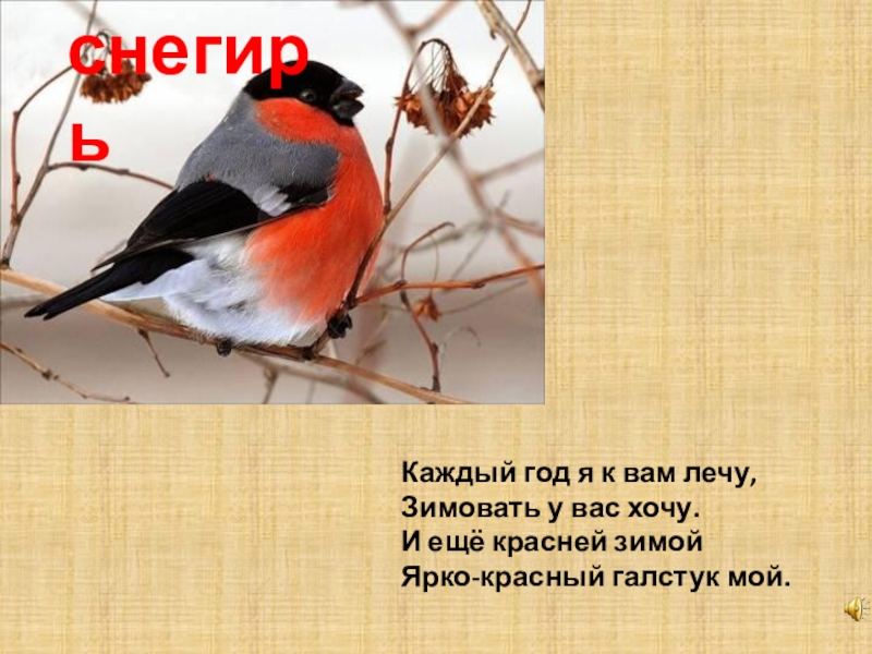 снегирьКаждый год я к вам лечу, Зимовать у вас хочу. И ещё красней зимой Ярко-красный галстук мой.
