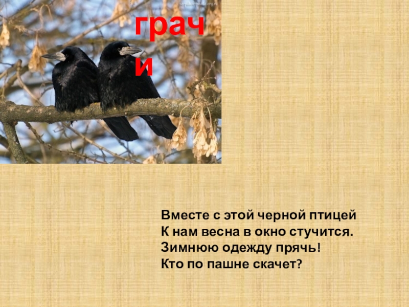 грачиВместе с этой черной птицей К нам весна в окно стучится. Зимнюю одежду прячь! Кто по пашне