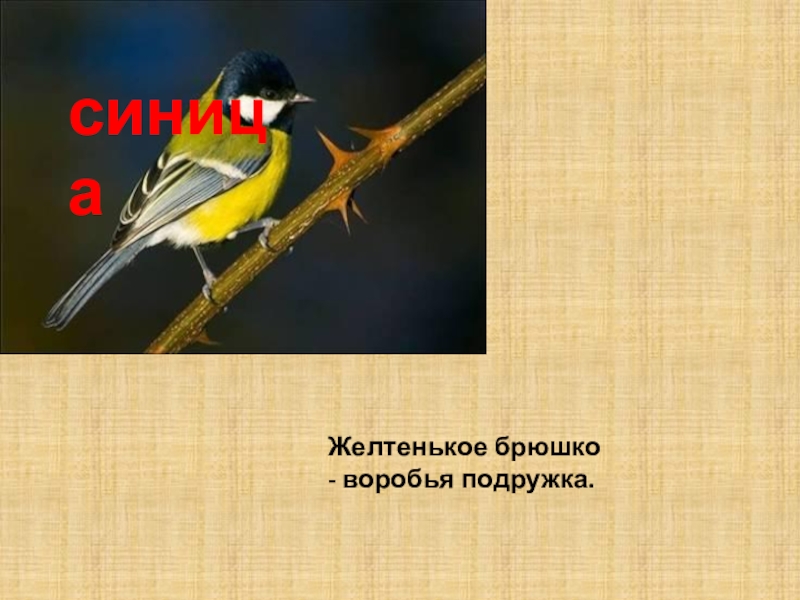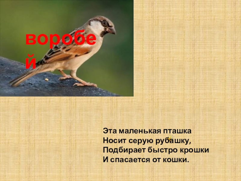 воробейЭта маленькая пташка Носит серую рубашку, Подбирает быстро крошки И спасается от кошки.