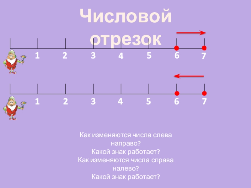 Числовой отрезок65432177654321Как изменяются числа слева направо?Какой знак работает?Как изменяются числа справа налево?Какой знак работает?