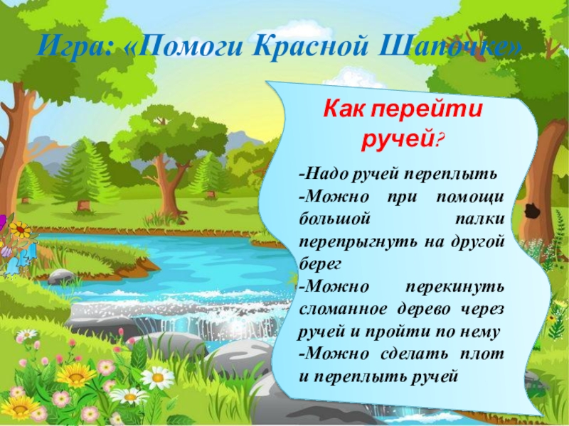 Игра: «Помоги Красной Шапочке» Как перейти ручей?-Надо ручей переплыть-Можно при помощи большой палки перепрыгнуть на другой берег-Можно