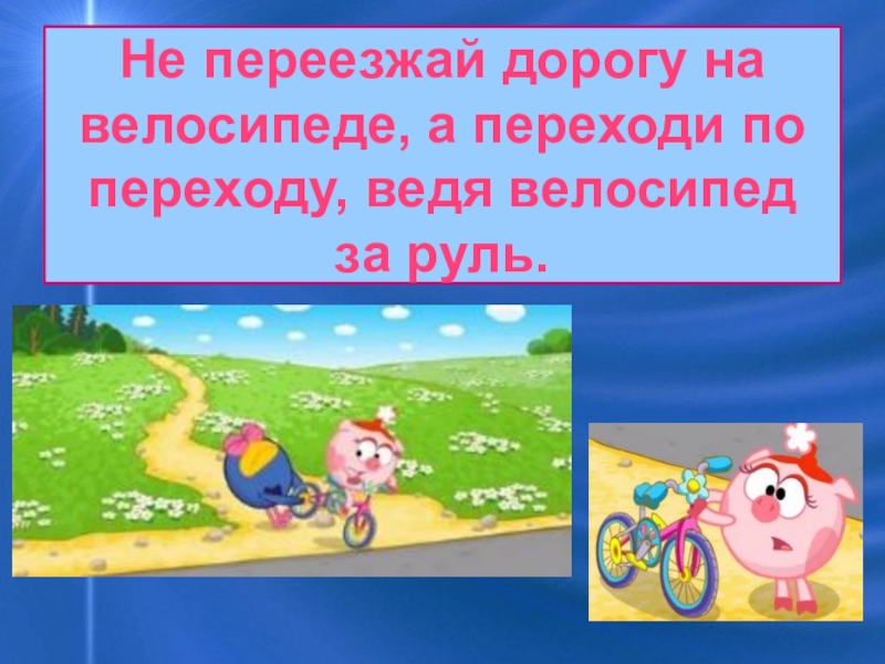Слайд 23Не переезжай дорогу на велосипеде, а переходи по переходу, ведя велосипед