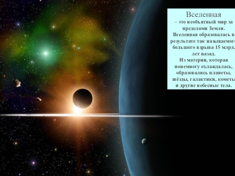 Из материи, которая понемногу охлаждалась, образовались планеты, звёзды, галактики, кометы и другие небесные тела.