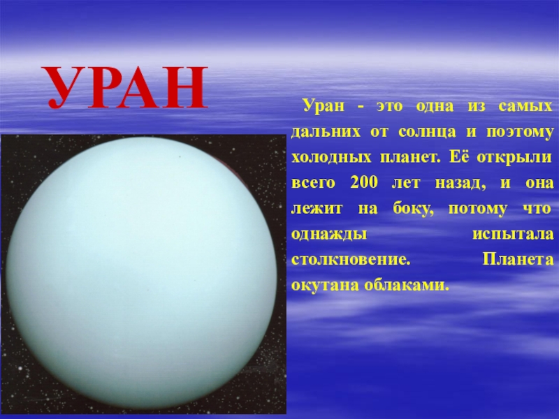 холодных планет. Её открыли всего 200 лет назад, и она лежит на боку, потому что однажды испытала столкновение. Планета окутана облаками.