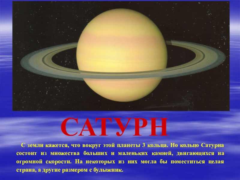 Сатурна состоит из множества больших и маленьких камней, двигающихся на огромной скорости. На некоторых из них могла бы поместиться целая страна, а другие размером с булыжник.