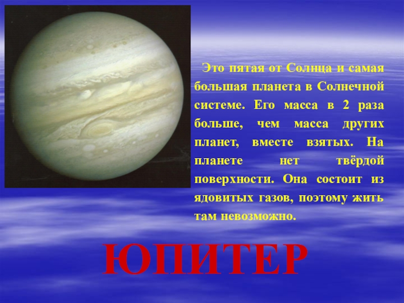 Это пятая от Солнца и самая большая планета в Солнечной системе.