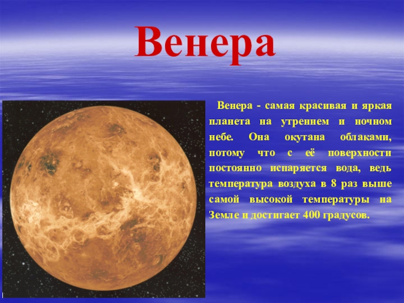 небе. Она окутана облаками, потому что с её поверхности постоянно испаряется вода, ведь температура воздуха в 8 раз выше самой высокой температуры на Земле и достигает 400 градусов.