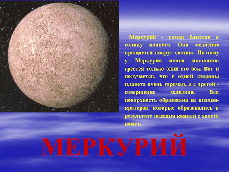 солнца. Поэтому у Меркурия почти постоянно греется только один его бок. Вот и получается, что с одной стороны планета очень горячая, а с другой - совершенно холодная. Вся поверхность образована из впадин-кратеров, которые образовались в результате падения камней с хвоста комет.