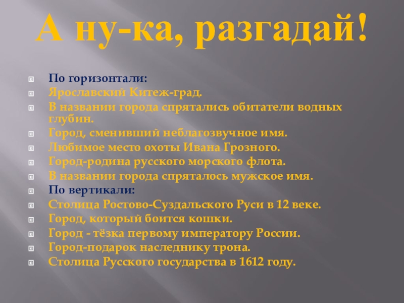 А ну-ка, разгадай!По горизонтали:Ярославский Китеж-град.В названии города спрятались обитатели водных глубин.Город, сменивший неблагозвучное имя.Любимое место охоты Ивана Грозного.Город-родина русского морского флота.В названии города спряталось мужское имя.По вертикали:Столица Ростово-Суздальского Руси в 12 веке.Город, который боится кошки.Город -