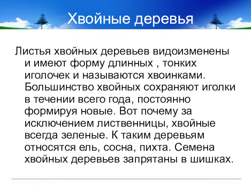 Листья хвойных деревьев видоизменены и имеют форму длинных , тонких