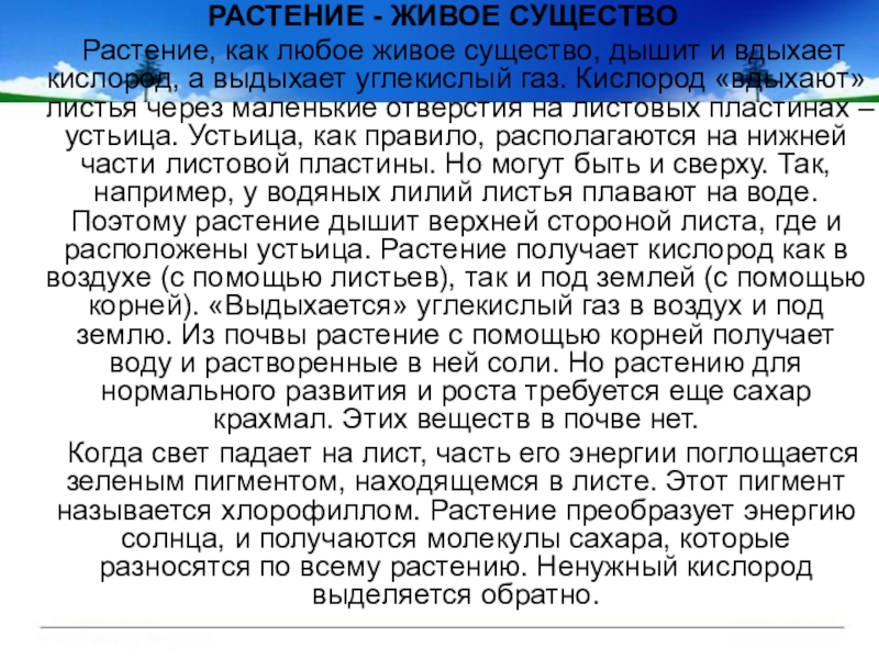 существо, дышит и вдыхает кислород, а выдыхает углекислый газ. Кислород «вдыхают» листья через маленькие отверстия на листовых пластинах – устьица. Устьица, как правило, располагаются на нижней части листовой пластины. Но могут быть и сверху. Так, например, у водяных лилий листья плавают на воде. Поэтому растение дышит верхней стороной листа, где и расположены устьица. Растение получает кислород как в воздухе (с помощью листьев), так и под землей (с помощью корней). «Выдыхается» углекислый газ в воздух и под землю. Из почвы растение с помощью корней получает воду и растворенные в ней соли. Но растению для нормального развития и роста требуется еще сахар крахмал. Этих веществ в почве нет.