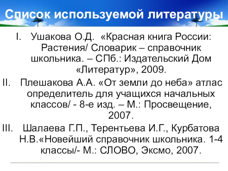 Плешакова А.А. «От земли до неба» атлас определитель для учащихся начальных классов/ - 8-е изд. – М.: Просвещение, 2007.
