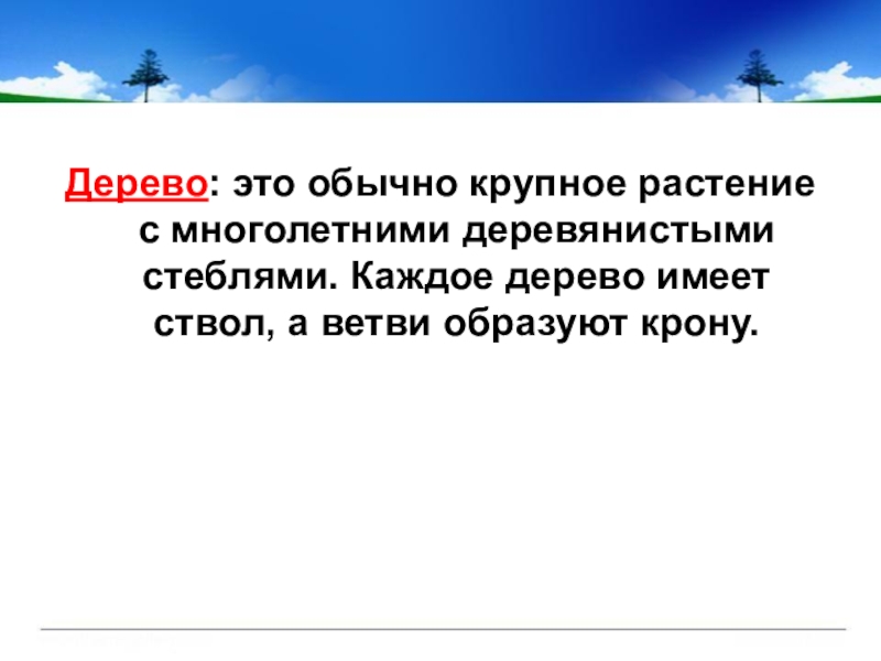 Дерево: это обычно крупное растение с многолетними деревянистыми стеблями. Каждое дерево