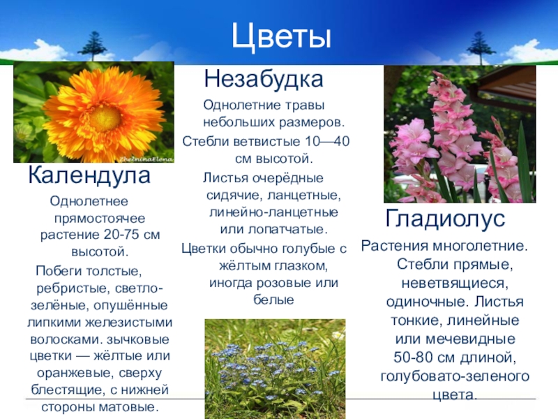 Цветки обычно голубые с жёлтым глазком, иногда розовые или белые