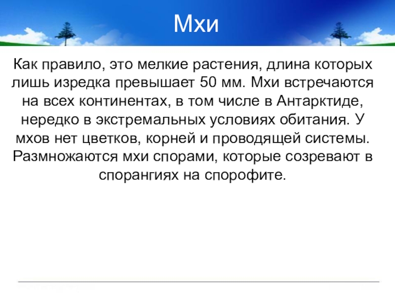мм. Мхи встречаются на всех континентах, в том числе в Антарктиде, нередко в экстремальных условиях обитания. У мхов нет цветков, корней и проводящей системы. Размножаются мхи спорами, которые созревают в спорангиях на спорофите.