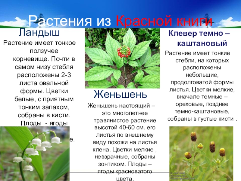 Женьшень настоящий – это многолетнее травянистое растение высотой 40-60 см. его листья по внешнему виду похожи на листья клена. Цветки мелкие , невзрачные, собраны зонтиком. Плоды – ягоды красноватого цвета.