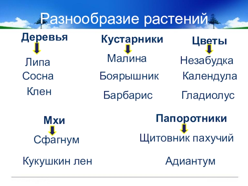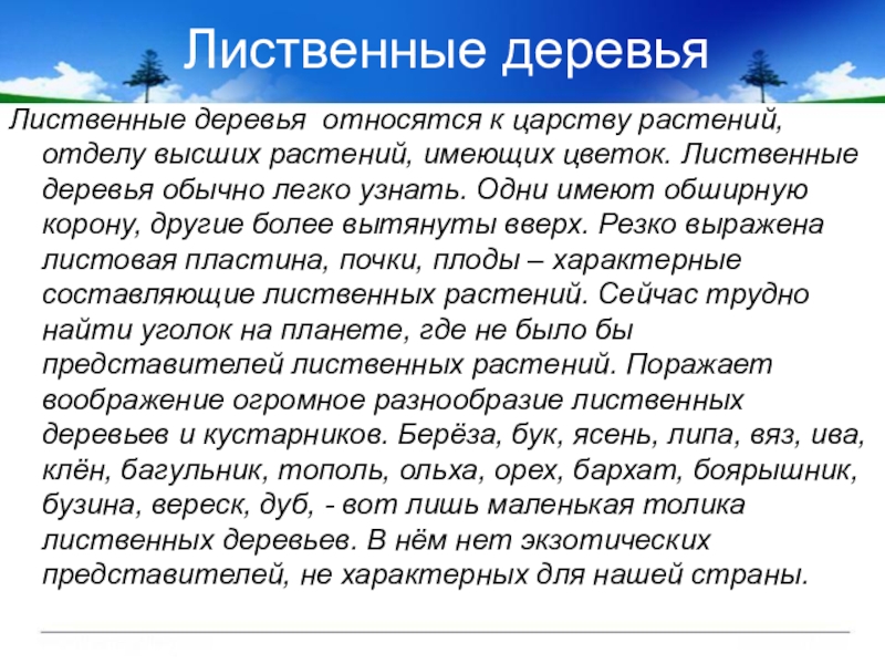 имеющих цветок. Лиственные деревья обычно легко узнать. Одни имеют обширную корону, другие более вытянуты вверх. Резко выражена листовая пластина, почки, плоды – характерные составляющие лиственных растений. Сейчас трудно найти уголок на планете, где не было бы представителей лиственных растений. Поражает воображение огромное разнообразие лиственных деревьев и кустарников. Берёза, бук, ясень, липа, вяз, ива, клён, багульник, тополь, ольха, орех, бархат, боярышник, бузина, вереск, дуб, - вот лишь маленькая толика лиственных деревьев. В нём нет экзотических представителей, не характерных для нашей страны.