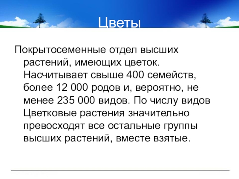 12 000 родов и, вероятно, не менее 235 000 видов. По числу видов Цветковые растения значительно превосходят все остальные группы высших растений, вместе взятые.