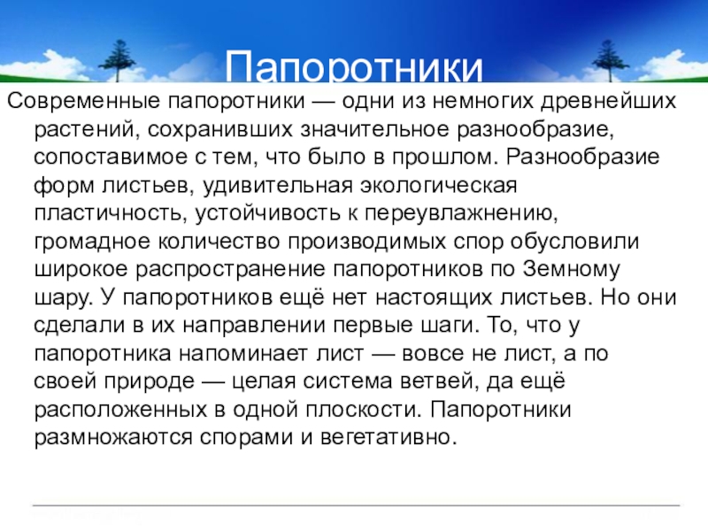 разнообразие, сопоставимое с тем, что было в прошлом. Разнообразие форм листьев, удивительная экологическая пластичность, устойчивость к переувлажнению, громадное количество производимых спор обусловили широкое распространение папоротников по Земному шару. У папоротников ещё нет настоящих листьев. Но они сделали в их направлении первые шаги. То, что у папоротника напоминает лист — вовсе не лист, а по своей природе — целая система ветвей, да ещё расположенных в одной плоскости. Папоротники размножаются спорами и вегетативно.
